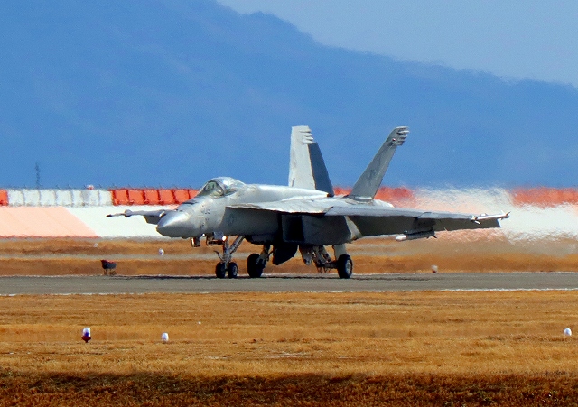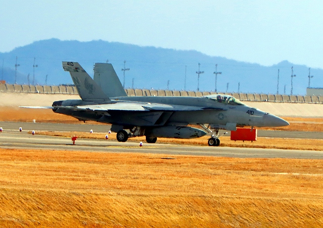 米海軍艦載機 F/A-18E スーパーホーネット 戦闘攻撃機(岩国基地)、NF、410番機が着陸 |