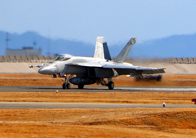 米海軍艦載機 F/A-18E スーパーホーネット 戦闘攻撃機(岩国基地)、NF、411番機が着陸 |