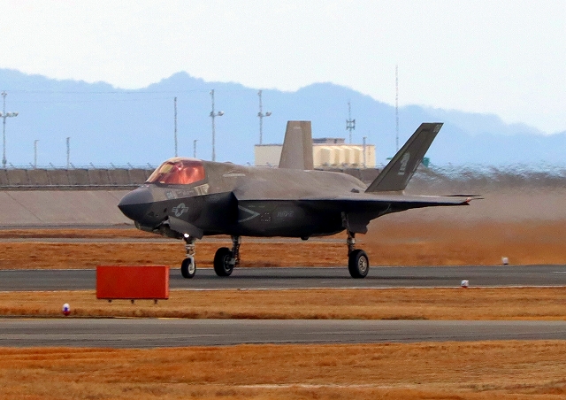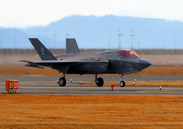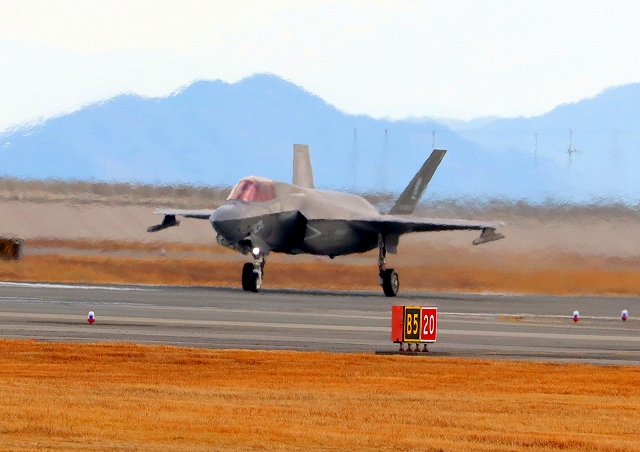 米海兵隊 F-35B ライトニングⅡ 戦闘機(岩国基地)、VK、08番機が着陸 14時00分に離陸した機。1時間21分の飛行でした。 |