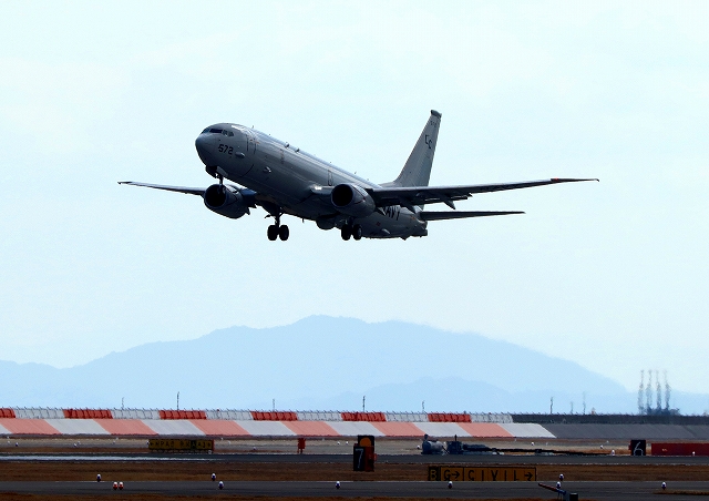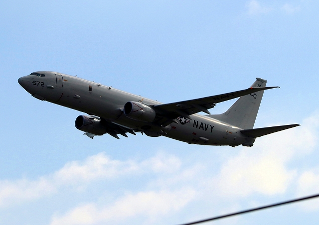米海軍 P-8A 海上哨戒機 ポセイドン(嘉手納基地、三沢基地)、LC、572番機がタッチアンドゴーして旋回(1周目) |