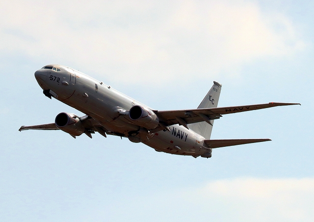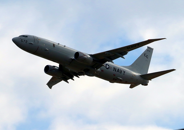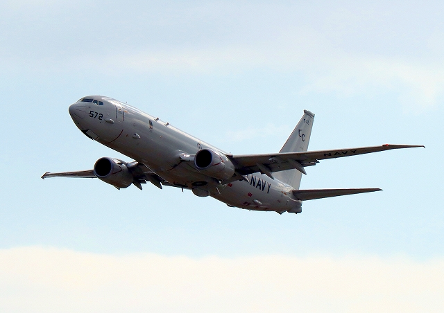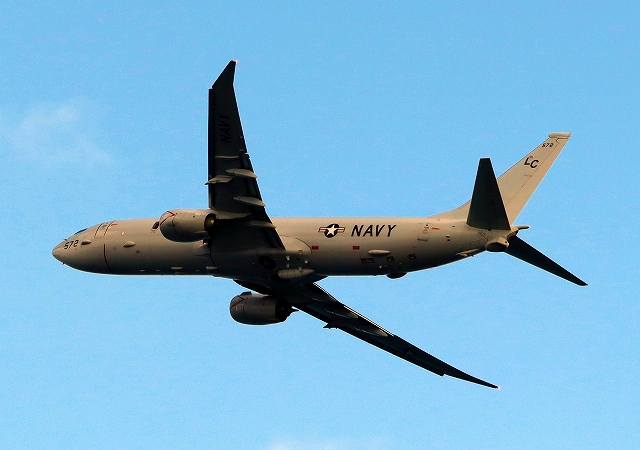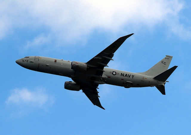 米海軍 P-8A 海上哨戒機 ポセイドン(嘉手納基地、三沢基地)、LC、572番機が旋回(4周目) |