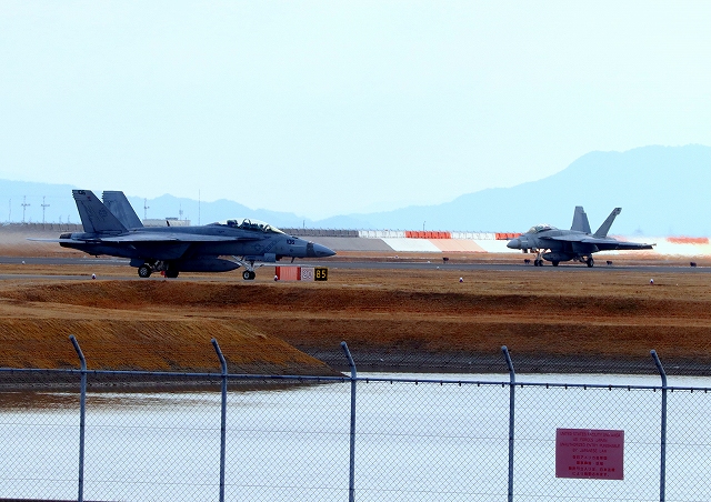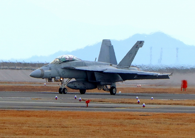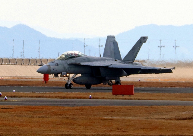 米海軍艦載機 F/A-18F スーパーホーネット 戦闘攻撃機(岩国基地)、NF、106番機が着陸 |