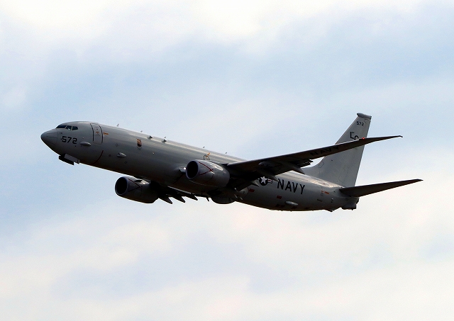 米海軍 P-8A 海上哨戒機 ポセイドン(嘉手納基地、三沢基地)、LC、572番機が旋回(5周目) |