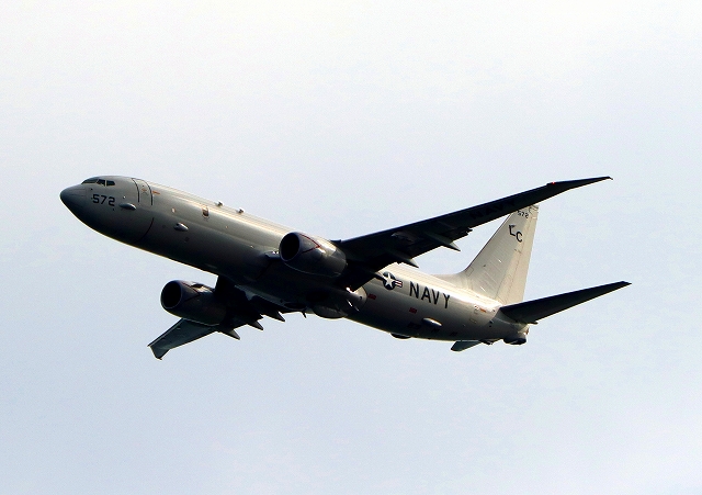 米海軍 P-8A 海上哨戒機 ポセイドン(嘉手納基地、三沢基地)、LC、572番機が旋回(14周目) |