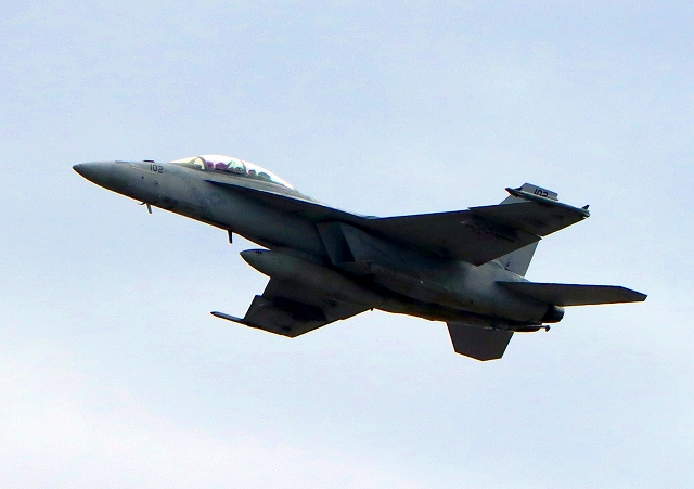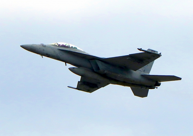 米海軍艦載機 F/A-18F スーパーホーネット 戦闘攻撃機(岩国基地)、NF、102番機が離陸 |