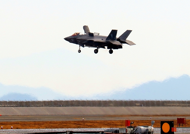 米海兵隊 F-35B ライトニングⅡ 戦闘機(岩国基地)、VK、04番機が、垂直着陸パッドの上に着陸パッドの上に着陸 |