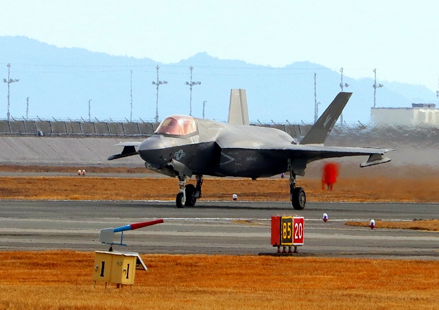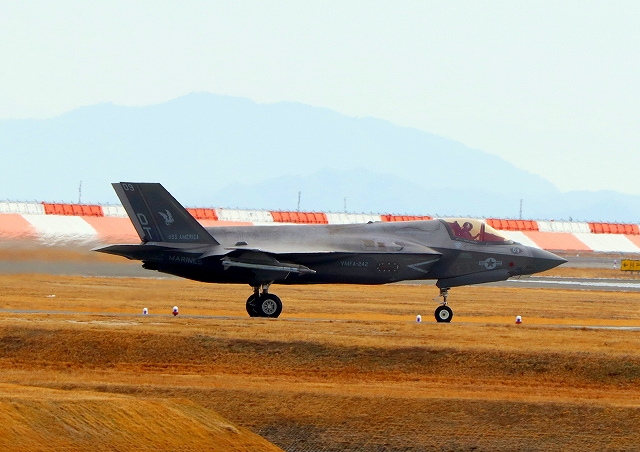 米海兵隊 F-35B ライトニングⅡ 戦闘機(岩国基地)、DT、14番機が着陸 13時09分に離陸した機。1時間17分の飛行でした。 |