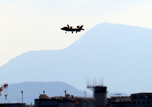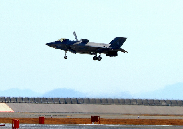 米海兵隊 F-35B ライトニングⅡ 戦闘機(岩国基地)が新しい垂直着陸パッドの上でホバリング |