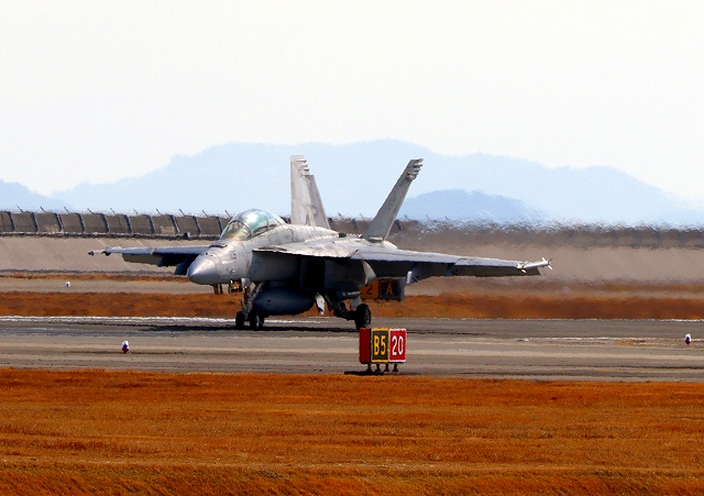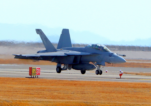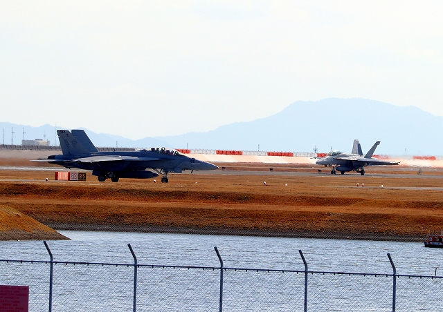 米海軍艦載機 F/A-18F スーパーホーネット 戦闘攻撃機(岩国基地)、NF、102番機が着陸 |