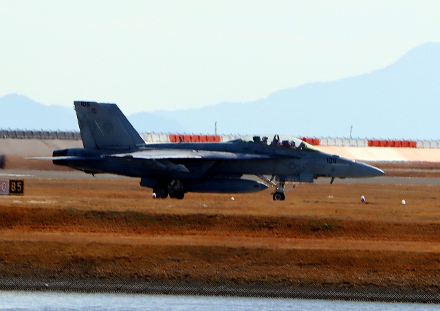 米海軍艦載機 F/A-18F スーパーホーネット 戦闘攻撃機(岩国基地)、NF、105番機が着陸 |