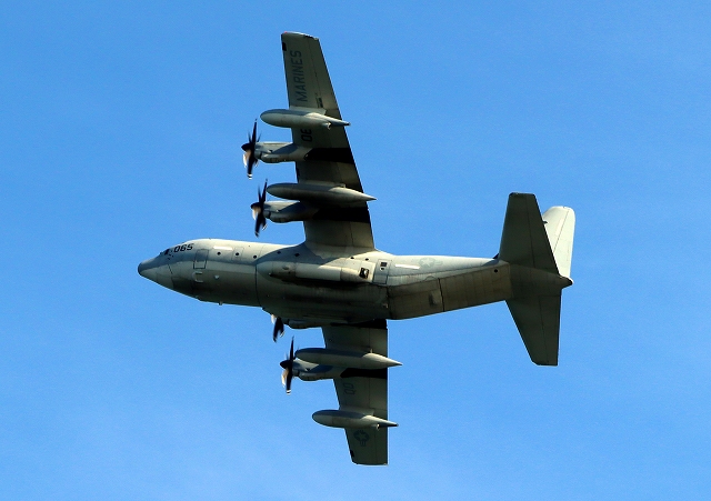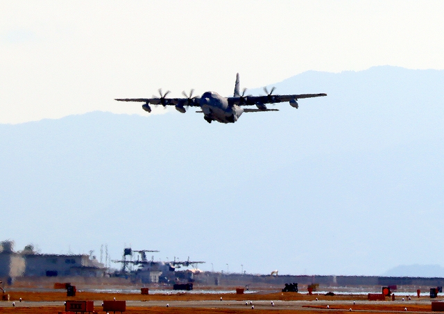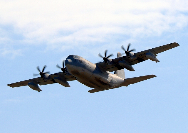 米海兵隊 KC-130J 空中給油機 スーパーハーキュリーズ(岩国基地)、8065番機が離陸 |
