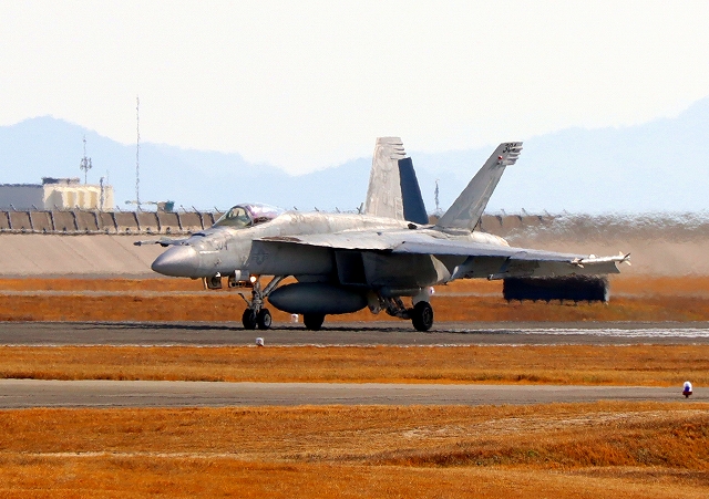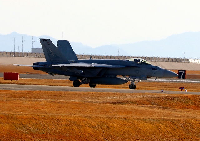 米海軍艦載機 F/A-18E スーパーホーネット 戦闘攻撃機(岩国基地)、NF、304番機が着陸 |