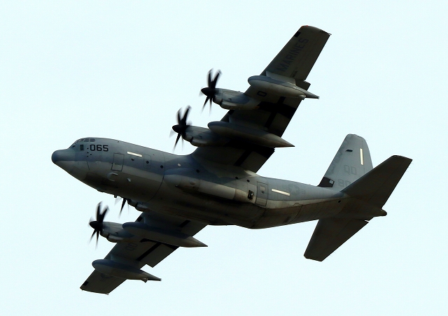 米海兵隊 KC-130J 空中給油機 スーパーハーキュリーズ(岩国基地)、8065番機が旋回(4周目) |