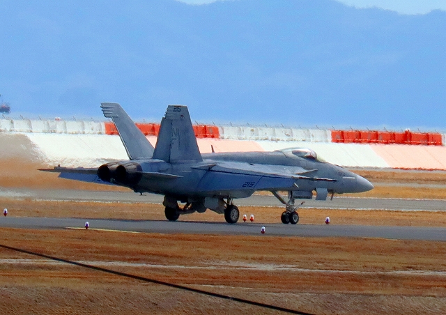 米海軍艦載機 F/A-18E スーパーホーネット 戦闘攻撃機(岩国基地)、NF、215番機、着陸 |