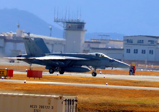 米海軍艦載機 F/A-18E スーパーホーネット 戦闘攻撃機(岩国基地)、NF、203番機、着陸 |