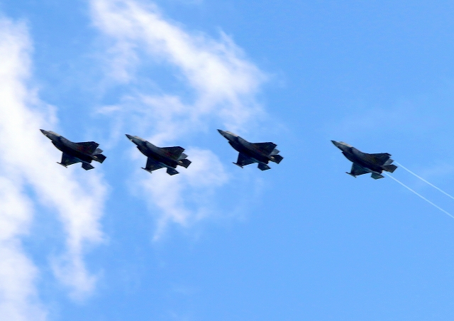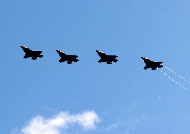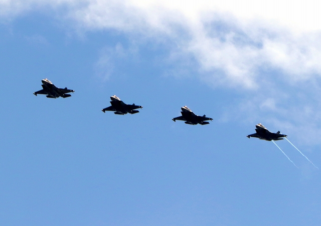 米海兵隊 F-35B ライトニングⅡ 戦闘機(岩国基地)、DT、05番機、09番機、15番機、11番機が4機編隊で帰還