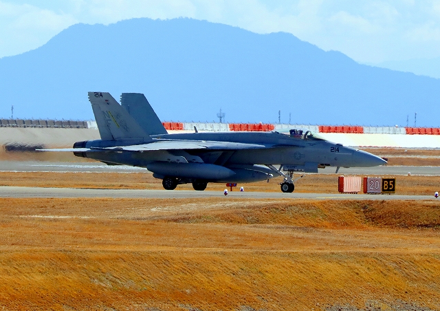 米海軍艦載機 F/A-18E スーパーホーネット 戦闘攻撃機(岩国基地)、NF、214番機が着陸 |