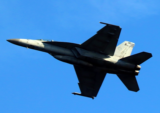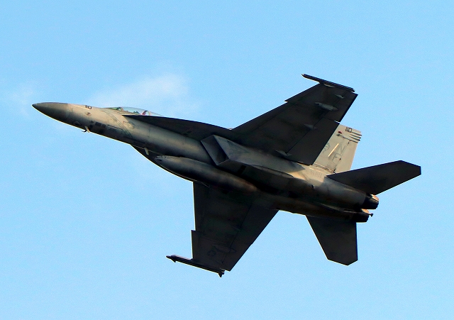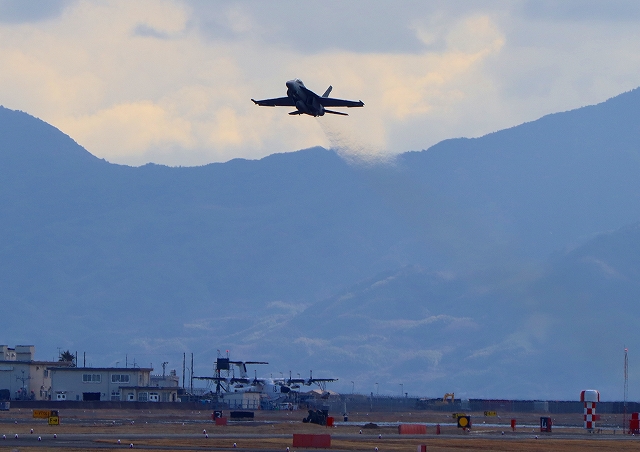 米海軍艦載機 F/A-18F スーパーホーネット 戦闘攻撃機(岩国基地)、NF、110番機が離陸 |