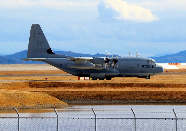 米海兵隊 KC-130J 空中給油機 スーパーハーキュリーズ(米本土海兵隊基地)、KB 0273番機が着陸 |