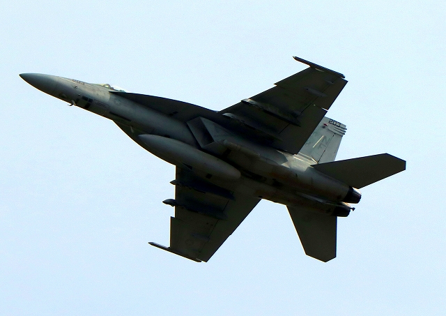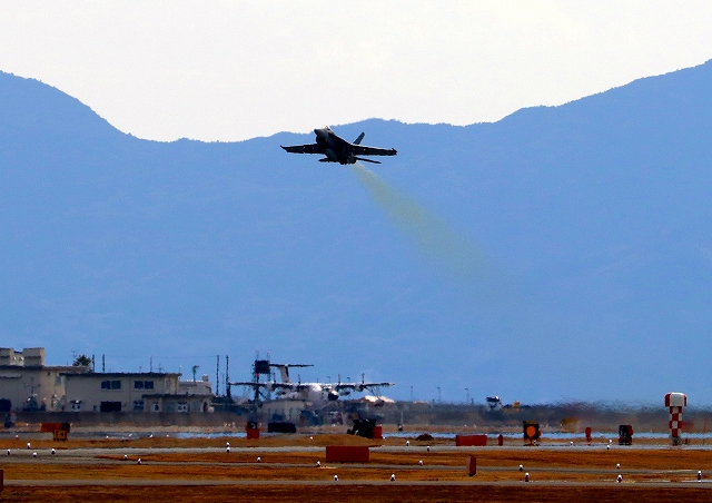 米海軍艦載機 F/A-18E スーパーホーネット 戦闘攻撃機(岩国基地)、NF、203番機が離陸 |