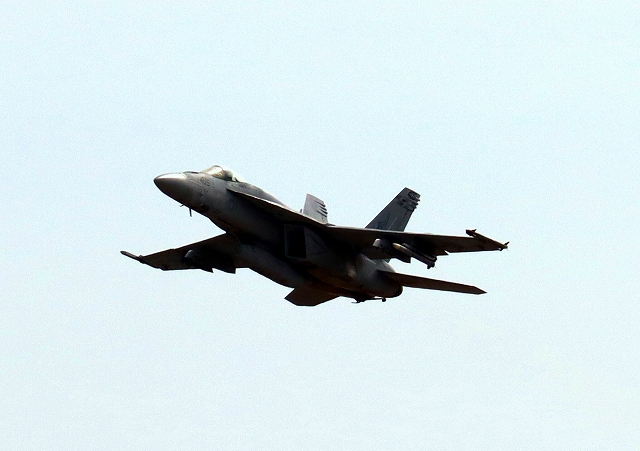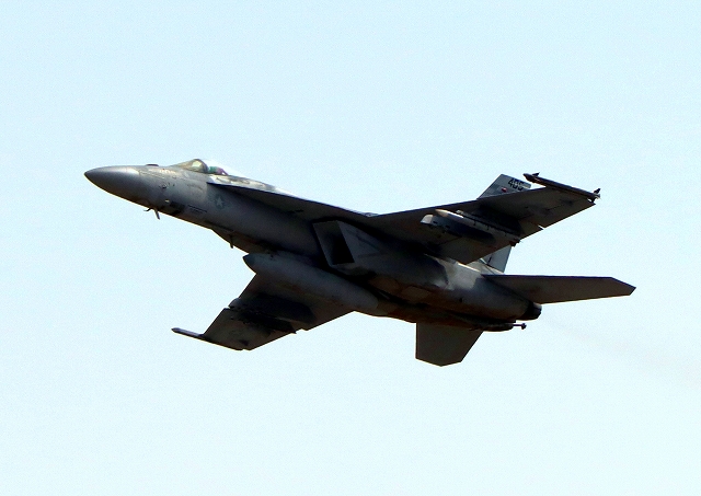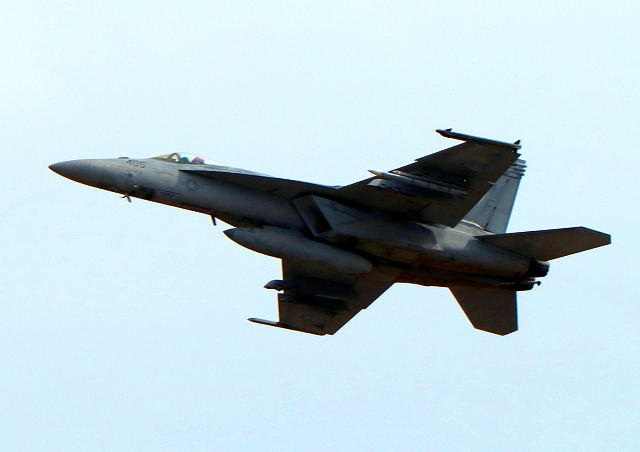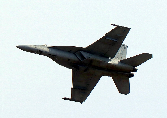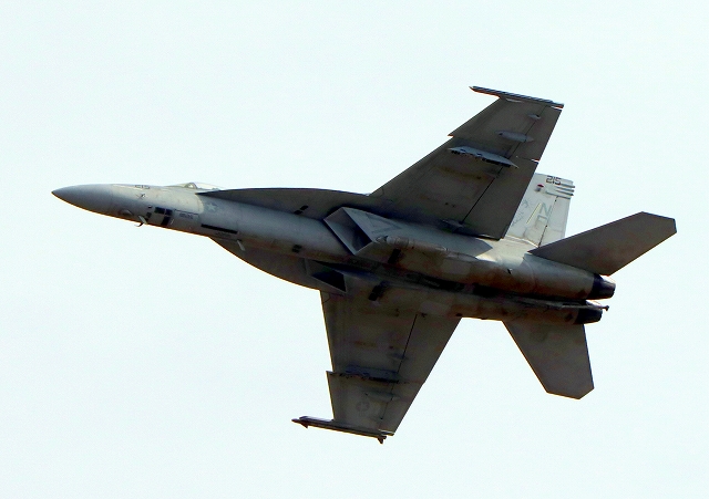 米海軍艦載機 F/A-18E スーパーホーネット 戦闘攻撃機(岩国基地)、NF、215番機が離陸 |