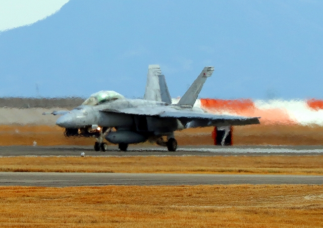 米海軍艦載機 F/A-18E スーパーホーネット 戦闘攻撃機(岩国基地)、NF、214番機が着陸 13時10分に離陸した機。1時間20分の飛行でした。 |