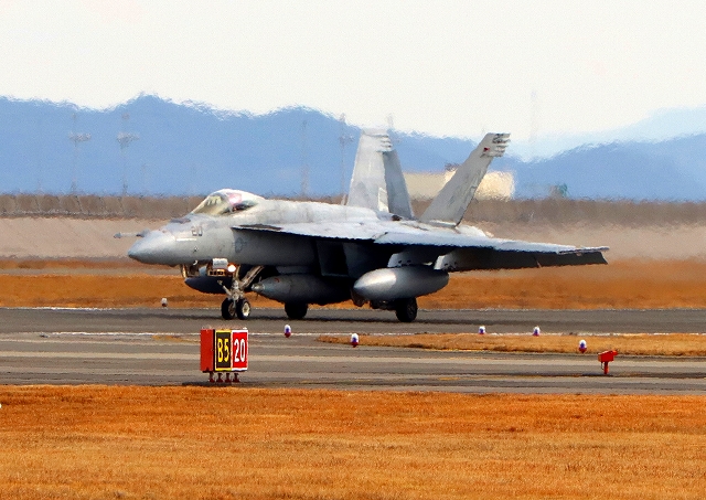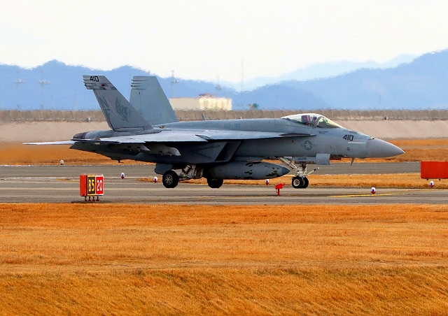 米海軍艦載機 F/A-18E スーパーホーネット 戦闘攻撃機(岩国基地)、NF、410番機が着陸 |
