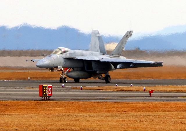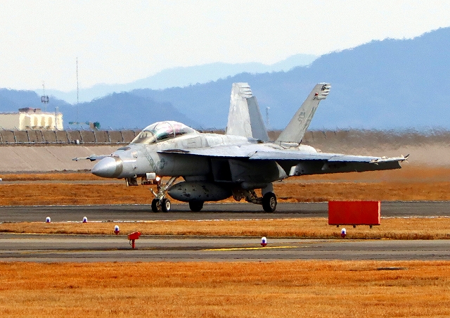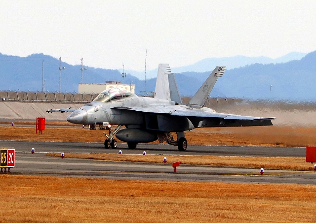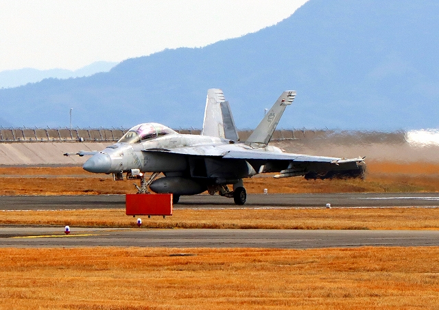 米海軍艦載機 F/A-18E スーパーホーネット 戦闘攻撃機(岩国基地)、NF、211番機が着陸 |