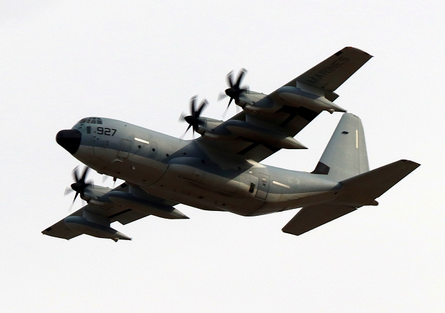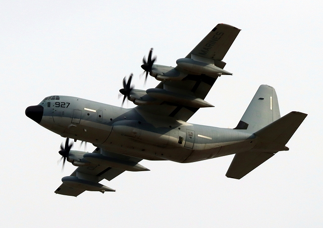 米海兵隊 KC-130J 空中給油機 スーパーハーキュリーズ(岩国基地)、7927番機が旋回 |