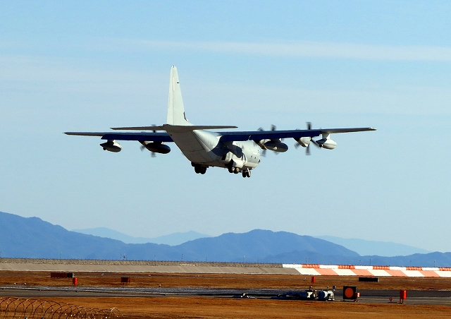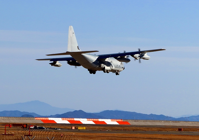 米海兵隊 KC-130J 空中給油機 スーパーハーキュリーズ(岩国基地)、QD 7927番機がタッチアンドゴーして旋回 |