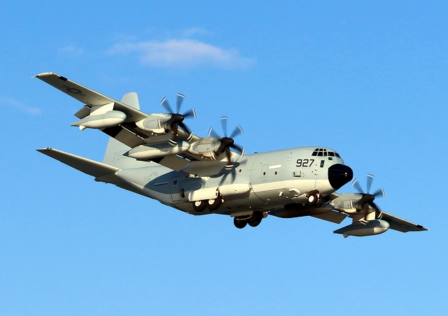 米海兵隊 KC-130J 空中給油機 スーパーハーキュリーズ(岩国基地)、QD 7927番機が旋回 |