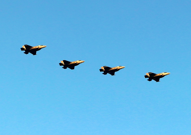 米海兵隊 F-35B ライトニングⅡ 戦闘機(岩国基地)、DT、09番機、16番機、VK、04番機、08番機が4機編隊で帰還 |