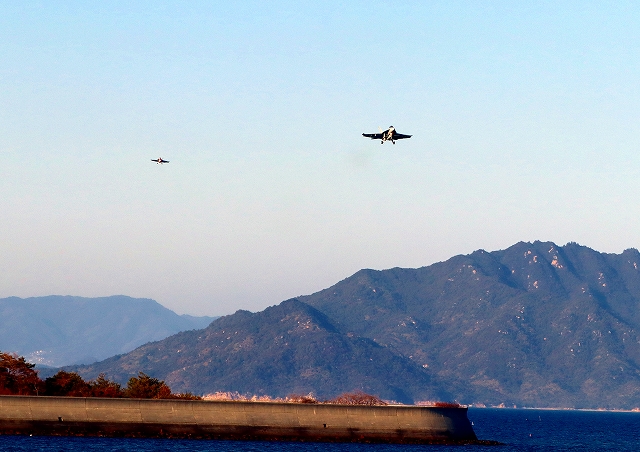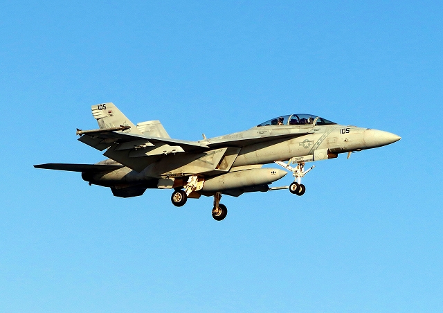 米海軍艦載機 F/A-18F スーパーホーネット 戦闘攻撃機(岩国基地)、NF、105番機、113番機が帰還 |