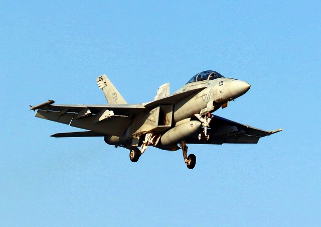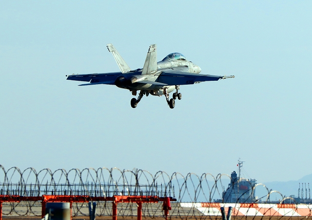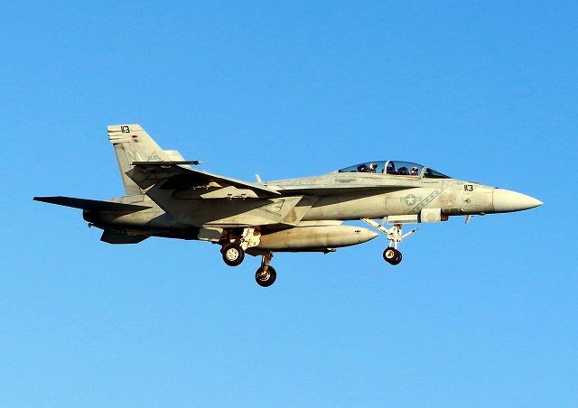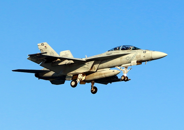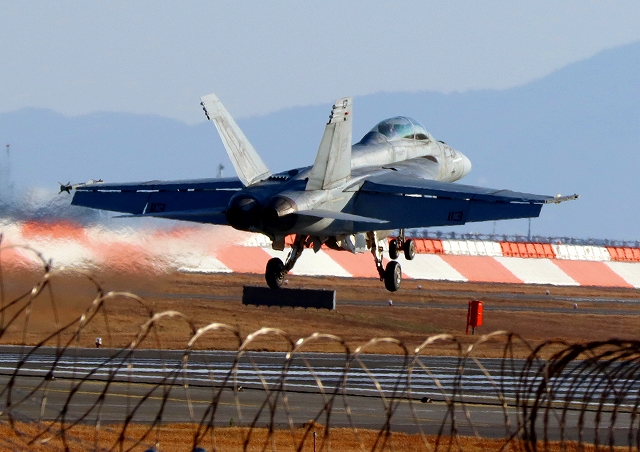 米海軍艦載機 F/A-18F スーパーホーネット 戦闘攻撃機(岩国基地)、NF、113番機が着陸 |
