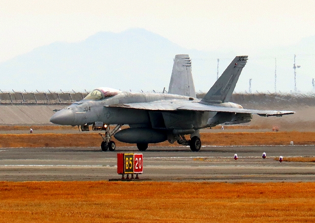 米海軍艦載機 F/A-18E スーパーホーネット 戦闘攻撃機(岩国基地)、NF、304番機が着陸 |