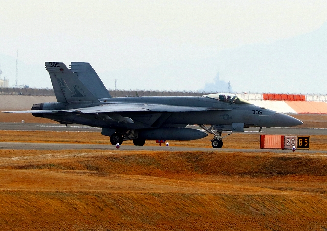 米海軍艦載機 F/A-18E スーパーホーネット 戦闘攻撃機(岩国基地)、NF、305番機が着陸 |