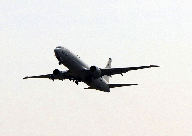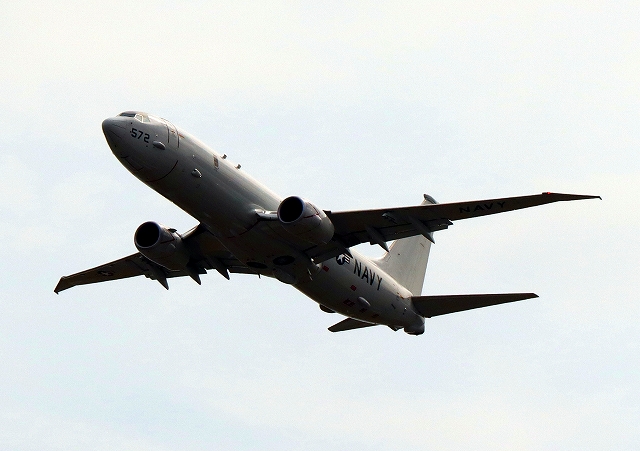 米海軍 P-8A 海上哨戒機 ポセイドン(嘉手納基地、三沢基地)、LC、572番機が旋回 |