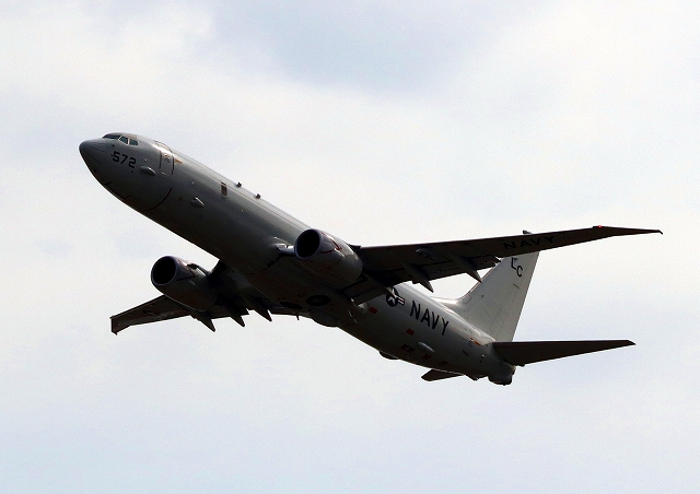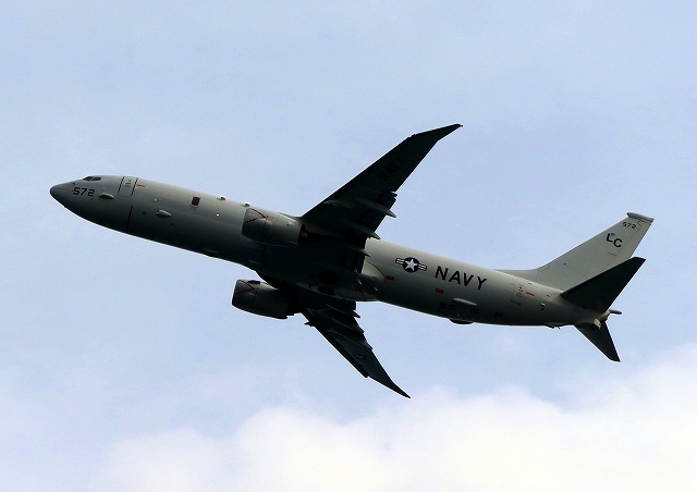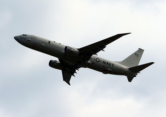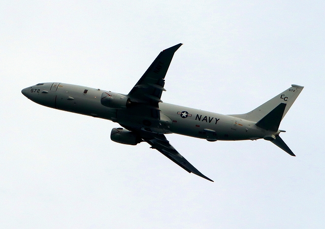 米海軍 P-8A 海上哨戒機 ポセイドン(嘉手納基地、三沢基地)、LC、572番機が旋回 |