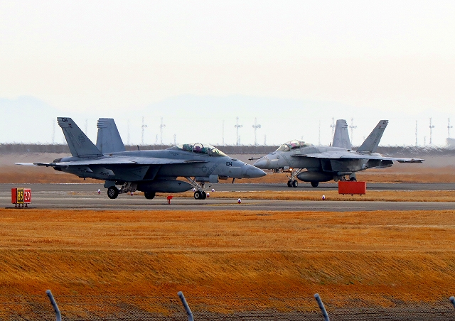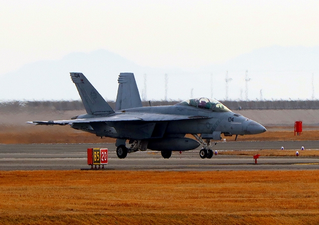米海軍艦載機 F/A-18F スーパーホーネット 戦闘攻撃機(岩国基地)、NF、104番機が着陸 |