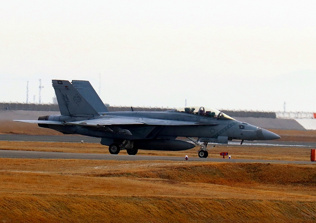 米海軍艦載機 F/A-18F スーパーホーネット 戦闘攻撃機(岩国基地)、NF、101番機が着陸 |