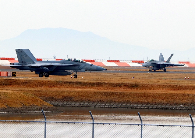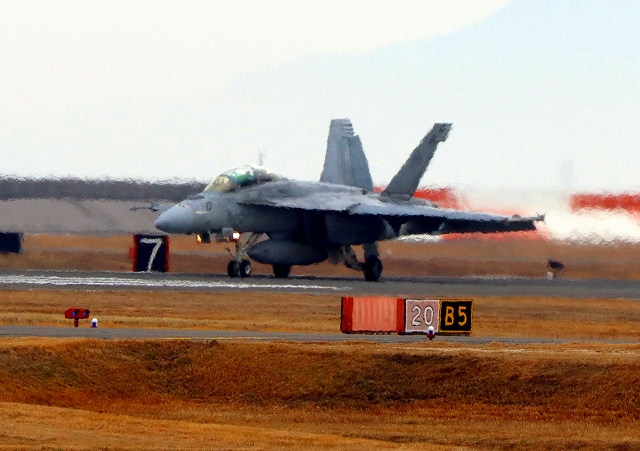 米海軍艦載機 F/A-18F スーパーホーネット 戦闘攻撃機(岩国基地)、NF、113番機が着陸 |