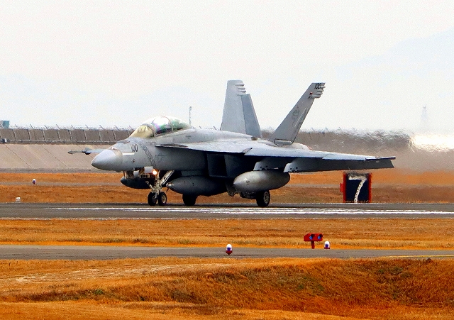 米海軍艦載機 F/A-18F スーパーホーネット 戦闘攻撃機(岩国基地)、NF、100番機が着陸 13時19分に離陸した機。59分間の飛行でした。 |