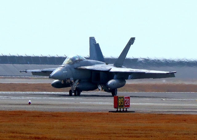 米海軍艦載機 F/A-18F スーパーホーネット 戦闘攻撃機(岩国基地)、NF、101番機が着陸 |