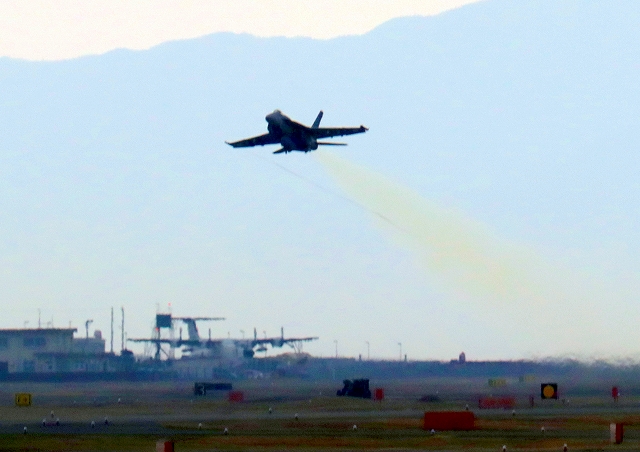 米海軍艦載機 F/A-18E スーパーホーネット 戦闘攻撃機(岩国基地)、NF、304番機が離陸 |