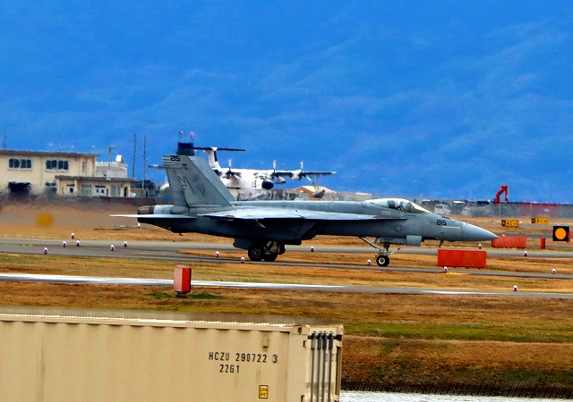 米海軍艦載機 F/A-18E スーパーホーネット 戦闘攻撃機(岩国基地)、NF、215番機、202番機が着陸 |