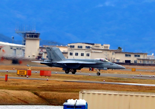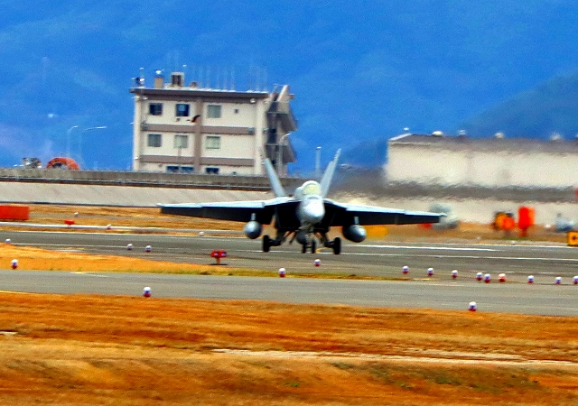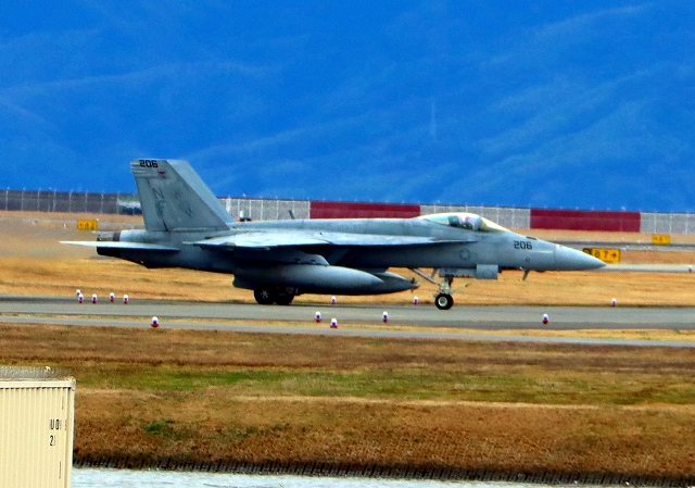 米海軍艦載機 F/A-18E スーパーホーネット 戦闘攻撃機(岩国基地)、NF、206番機が着陸 |