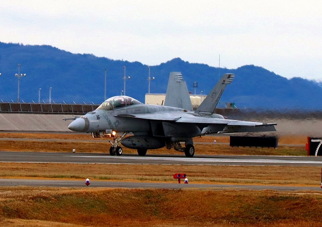 米海軍艦載機 F/A-18F スーパーホーネット 戦闘攻撃機(岩国基地)、NF、116番機が着陸 |