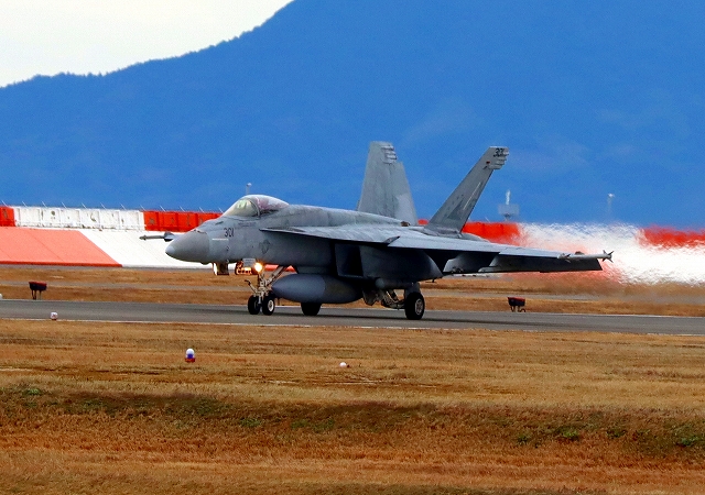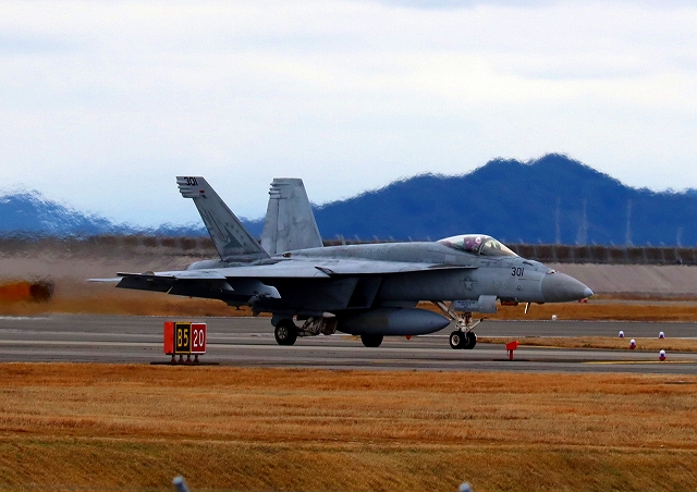 米海軍艦載機 F/A-18E スーパーホーネット 戦闘攻撃機(岩国基地)、NF、301番機が着陸 |