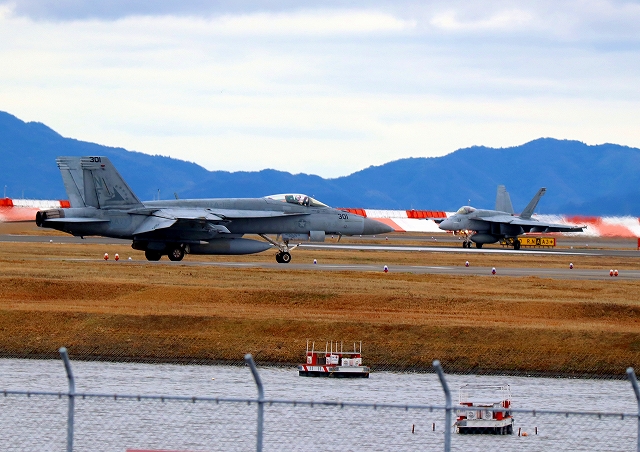 米海軍艦載機 F/A-18E スーパーホーネット 戦闘攻撃機(岩国基地)、NF、301番機、304番機が着陸 |