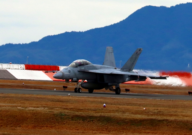 米海軍艦載機 F/A-18F スーパーホーネット 戦闘攻撃機(岩国基地)、NF、101番機が着陸 |
